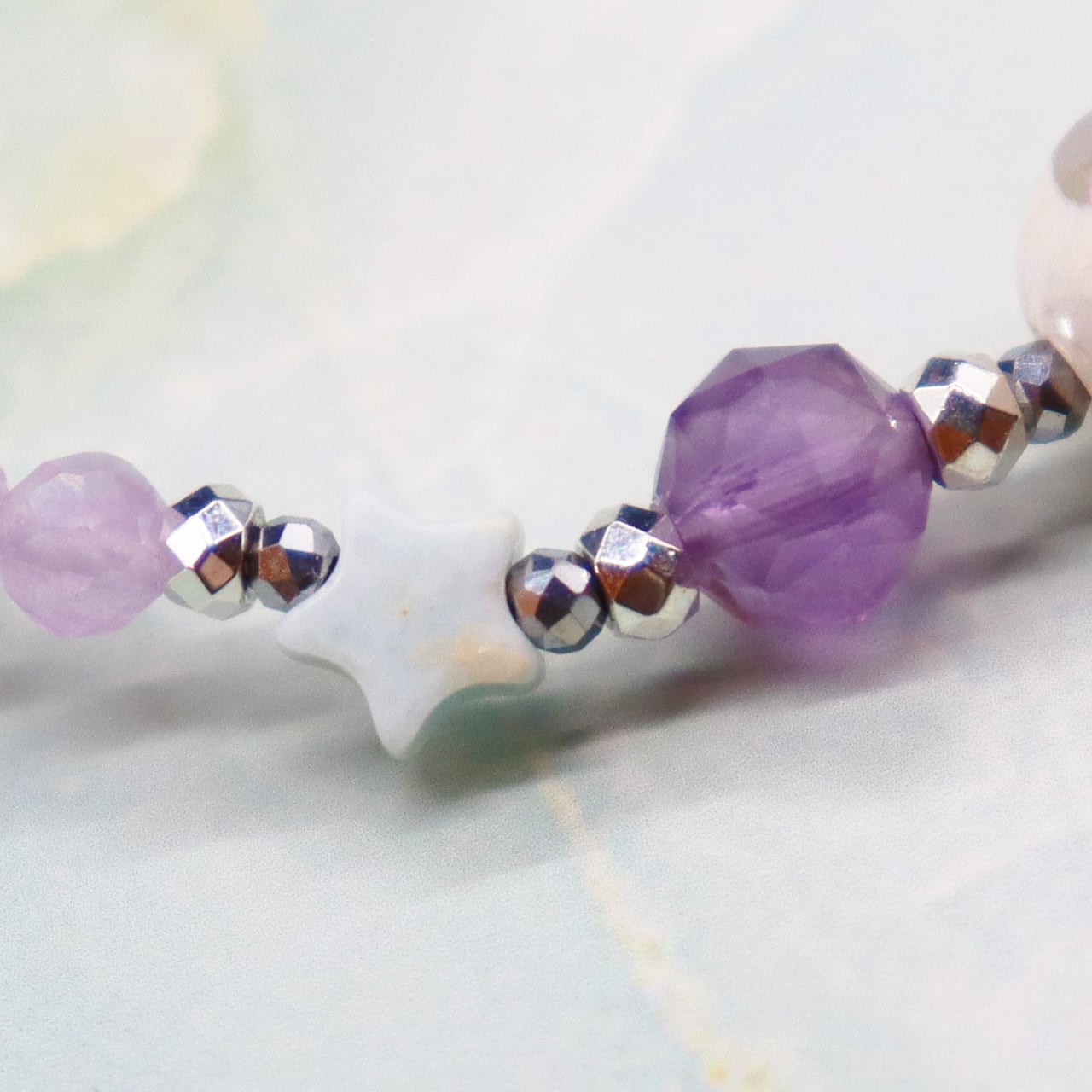 2月誕生石。淡いラベンダーカラーのアメジストをラベンダーアメジストと呼びます。アメジスト は「愛の守護石」と呼ばれるように、愛と慈しみの心を芽生えさせることによって、真実の愛を守るパワーを与えてくれるといわれています。また、精神状態を安定させ、人生における苦しみや不安等のネガティブな要素を和らげ、ストレスで疲れた心を癒し、落ち着かせ、穏やかな安らぎを与えてくれるといわれています。