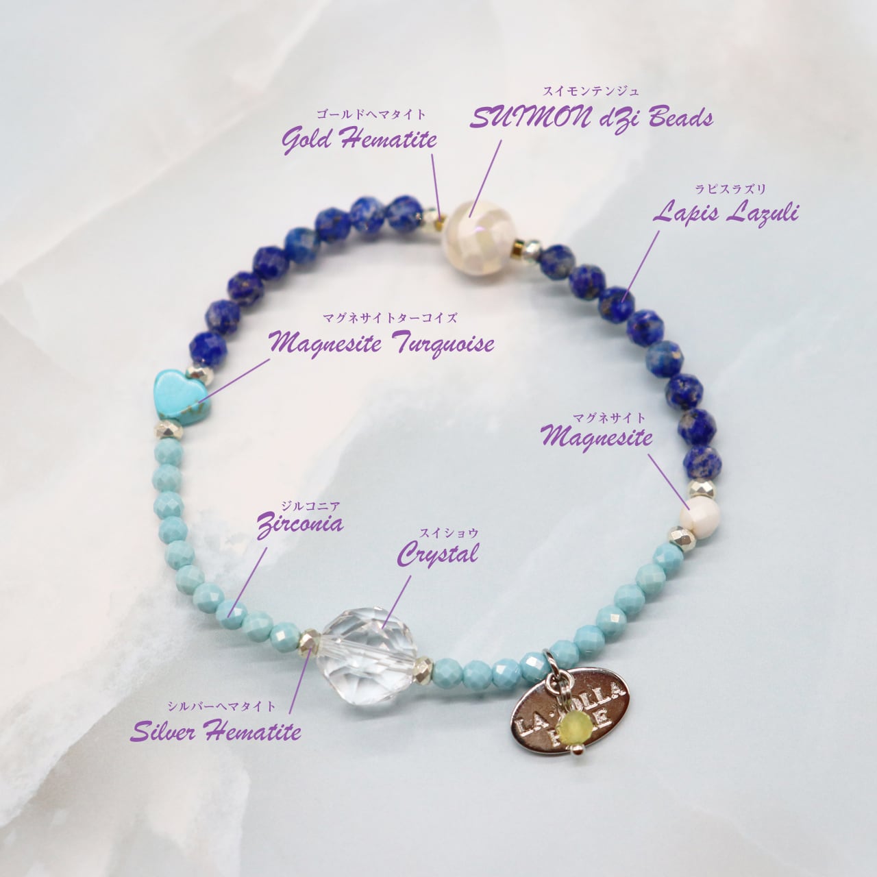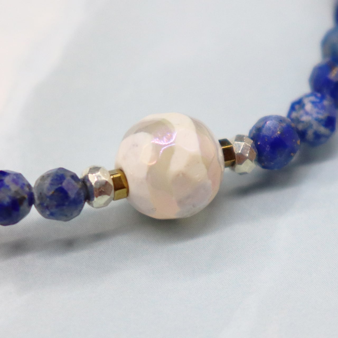 9月誕生石。深く鮮やかな群青に、金色が星の様に散りばめられた夜空を思わせる神秘的な宝石「ラピスラズリ」は、幸運を呼ぶ石として知られています。古来より美しさと力を兼ね備えた石として愛され続けるラピスラズリは、世界で最も古いパワーストーンのひとつと言われています。深い青を「夜空」金色を「星」として 、天空のように青く美しい特徴的な姿から、「天空を象徴する聖なる石」として人々を魅了してきました。また、古代エジプトでは黄金に匹敵する価値のある、最高の力を秘めた護符として、王族の装飾品としても用いられていました。ラピスラズリは、持つ人の潜在的な問題を顕在化させ、その問題を解決する事から本質的に幸せに導くと言われています。また、人生において自分が進むべき本道に気づかせてくれる、カリスマ性を高める力を持つと言われています。