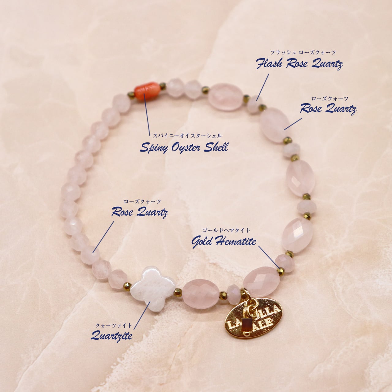 愛と美の女神「アフロディーテ」の石といわれる10月誕生石「ローズクォーツ」。神々は彼女の美しさを讃えるために、この世で最も美しい花「薔薇」を新たに創造しました。彼女が歩いた後の足元には薔薇の花が咲き乱れ、その薔薇が結晶化したものがローズクォーツだと云われています。咲き乱れるピンクの薔薇「ローズクォーツ」でデザインした【 Blooming Pink Roses】コレクション。