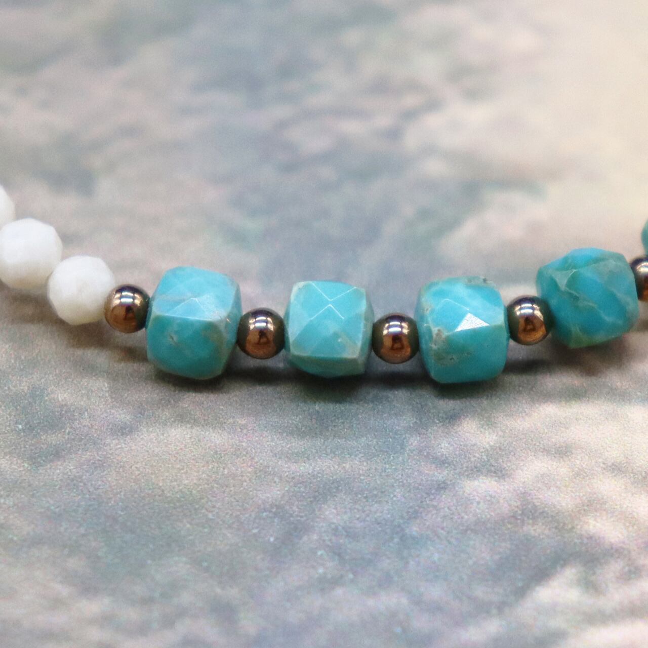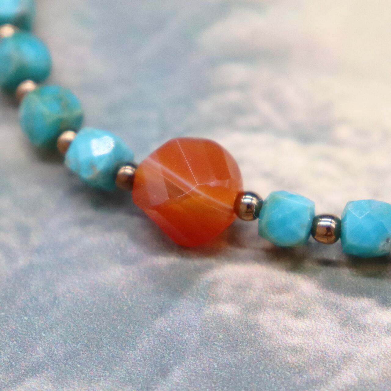 12月誕生石。人類とのかかわりが最も古い石のひとつと言われる美しく鮮やかなスカイブルーのターコイズは、「スカイストーン」とも呼ばれジュエリーだけではなく、パワーストーンとしても古くから人々に愛されてきました。美しい空色を思わせるスカイブルーが自然の大いなる力を秘めるとされ、大自然とともに生きるネイティブアメリカンにとっては特別に神聖な存在であったと伝えられています。彼らは、ターコイズを天の神々が宿る石と考え、危険や邪悪なエネルギーから持ち主を守り、勇気を与え幸福をもたらす石として大切にしてきました。災から身を守る「旅のお守り」として、古くから大切にされてきたターコイズ は、旅のお守りとしてだけではなく人生の守護石として身につけるのもおすすめです。また、大切な人が旅立つときに「離れてしまっても同じ空の下私達は繋がっている」という思いを込めて贈られたとされ、そのことから人から贈られた方が幸運のエネルギーが強いとも言われています。ターコイズ は非常にデリケートな石です。汗や水など汚れた時はすぐに優しく拭き取ることが重要です。