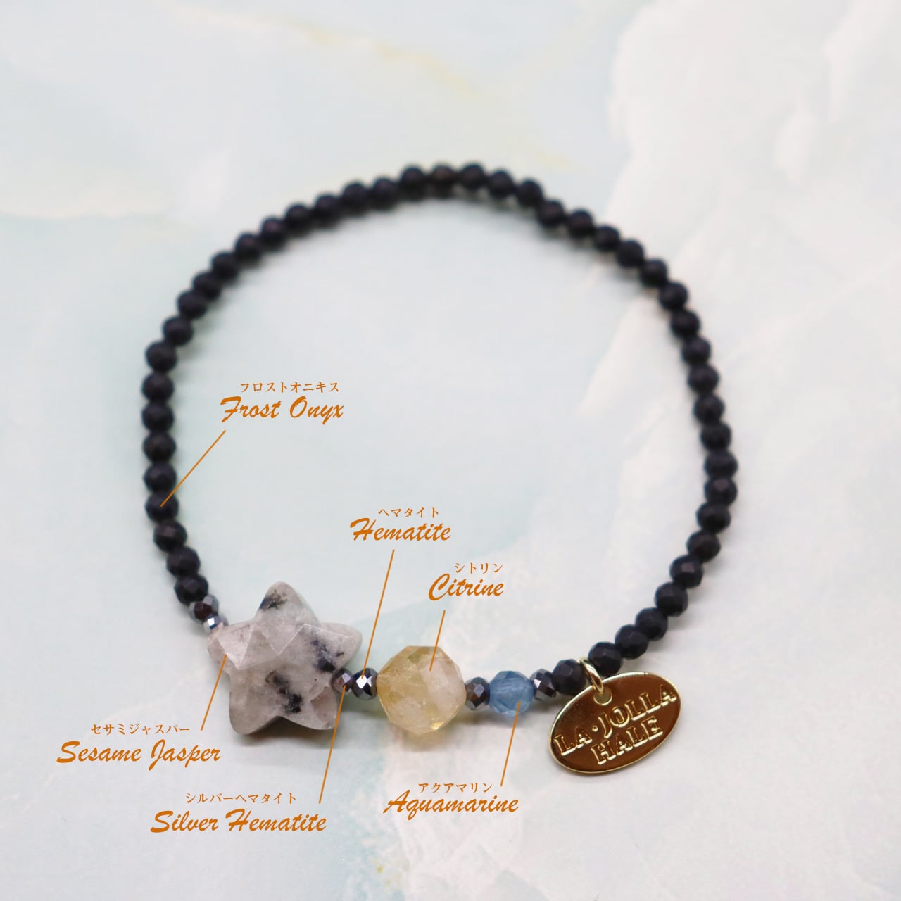 オニキスをフロスト加工した石です。着実に目標を実現する為に地に足をつけた行動をとれるように促してくれる、試練に耐え目標を達成するためのやり遂げる力を与えてくれると言われています。悪い意味での感情の起伏を押さえるため、夫婦の幸せを保つ効果もあると言われます。また、災よけ、魔除けの力が強い石と言われています。