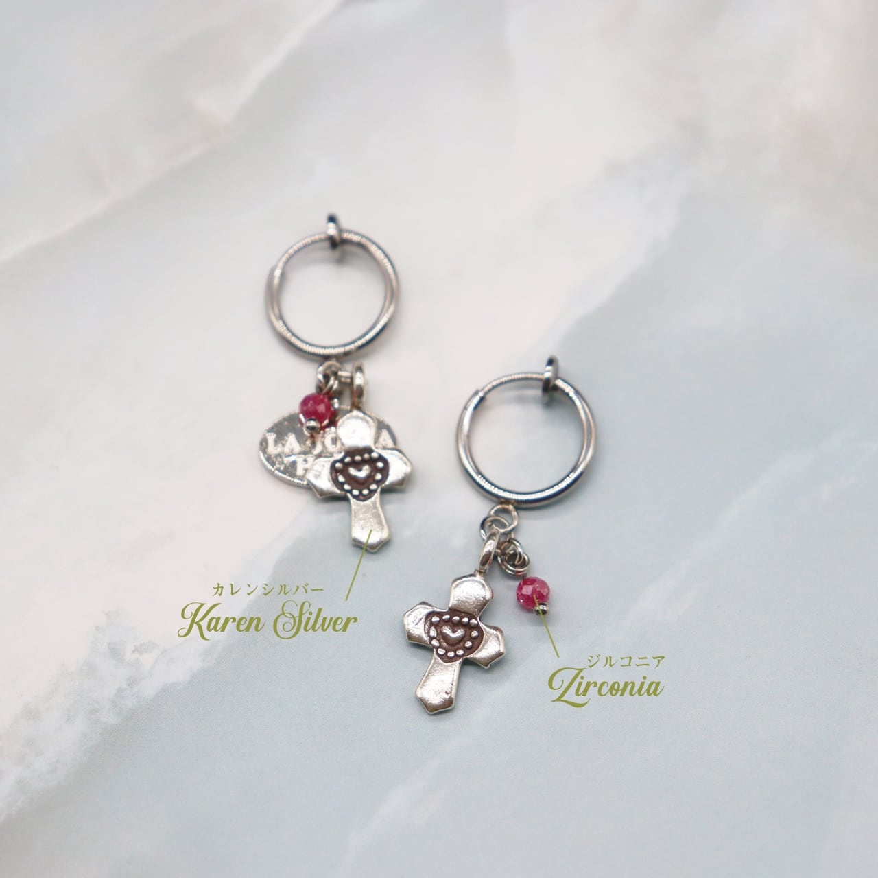 主にタイ北部〜ミャンマー周辺に暮らす少数民族「カレン族」が、一点一点手作業で作る高純度のシルバーのこと。本チャームには、カレン族のシルバーに多く見られるお守り的なモチーフが刻まれています。クロス(十字)モチーフは、西洋的な宗教意味合いというより、守護や魔除けのお守りとして用いられる形。中央のハート+ドット装飾は、カレンシルバー特有のデザインで、ハートは「愛・心・守護」を、周囲の点打ちは「魔除け・結界」の意味を持つとされています。