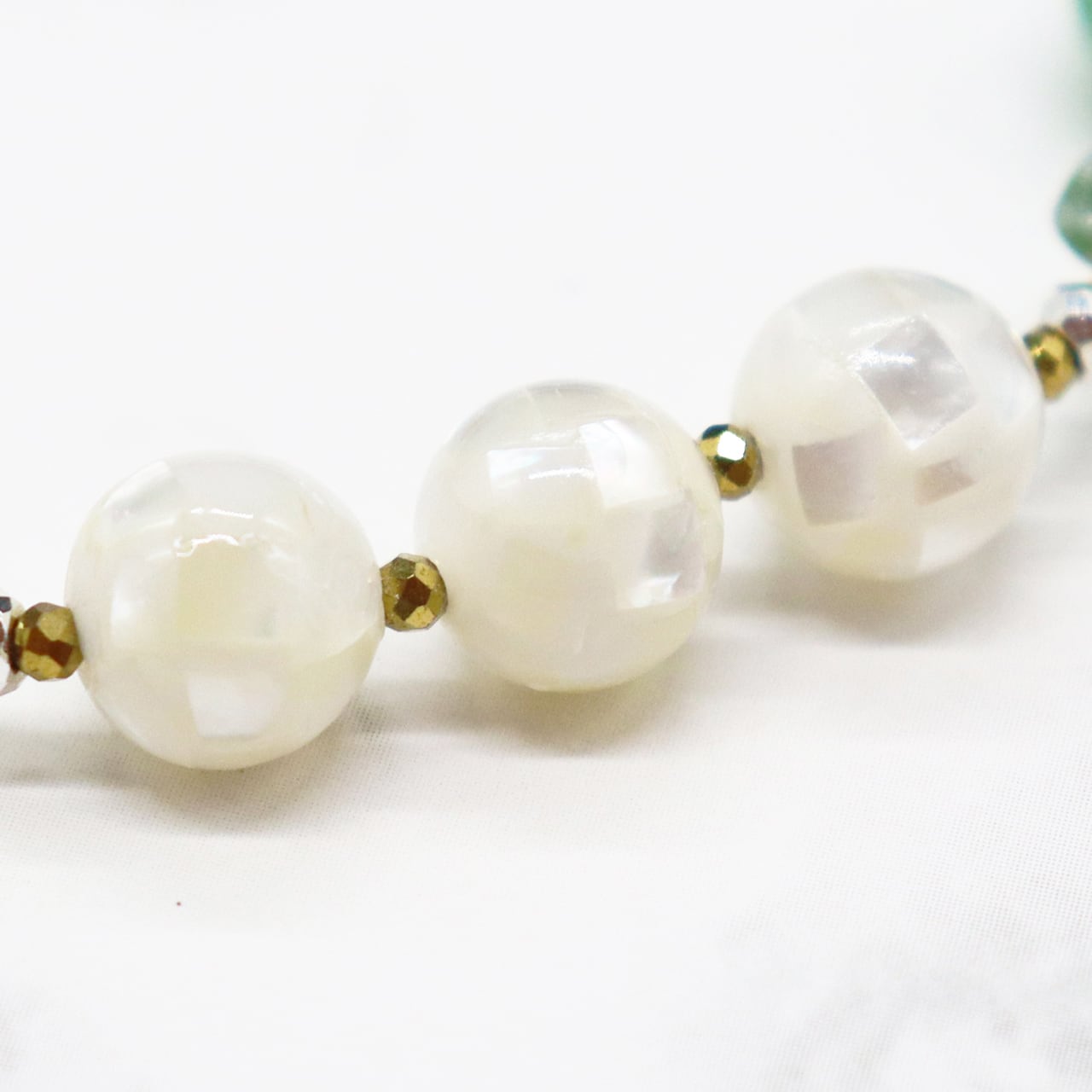 「貝パール」とはマザーオブパールをベースにパールのようなコーティングを施したもので、上品な光沢感があります。マザーオブパールは母性や親子愛を象徴する石と言われています。