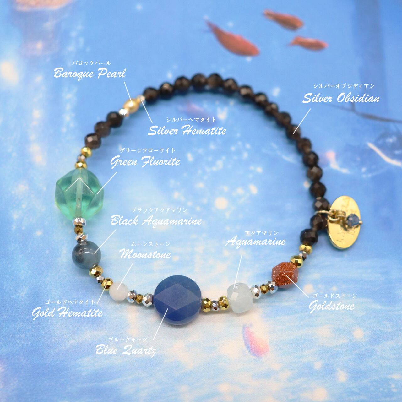 3月誕生石。ブラックアクアマリンは、ブラックマイカが内包されたアクアマリンで、夜明けの海を想わせる神秘的な石です。「海の石」とも言われ、癒しの力で感情的なエネルギーの滞りなどを洗い流し、良質なコミニュケーションをとる為のサポートをし、海のような穏やかさと寛容さで包み込み深い愛情へ導くと言われています。また何事にもとらわれない水のような柔軟性をもたらすと言われています。アクアマリンの名称は、ラテン語で水の意味の「aqua」と海の意味の「marinus」に由来し、神話では「美しい海底に住む妖精の宝石が、浜辺に打ち上げられた」とされ、古代より人々に愛され、崇められてきた強力な守護石としても伝えられています。