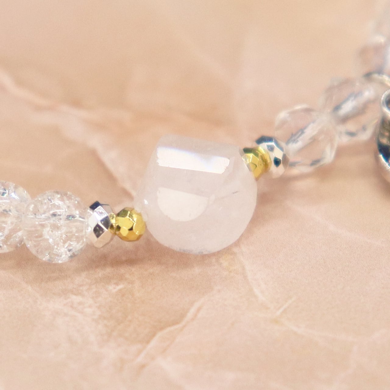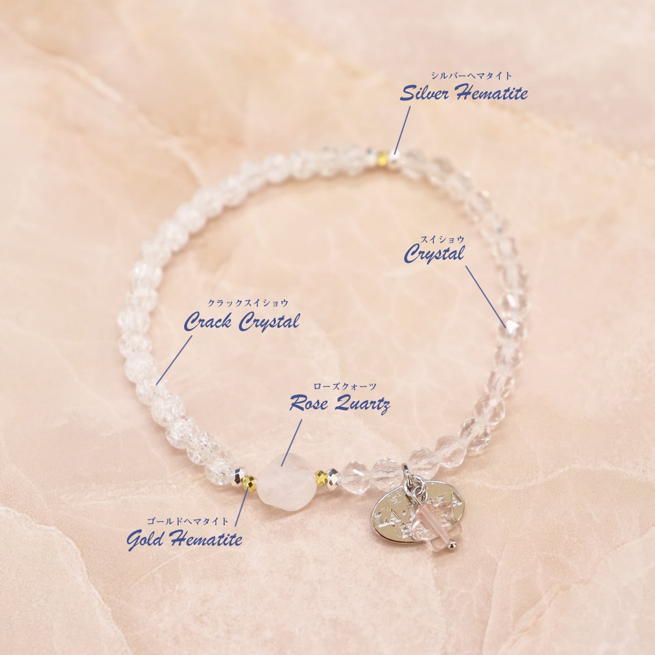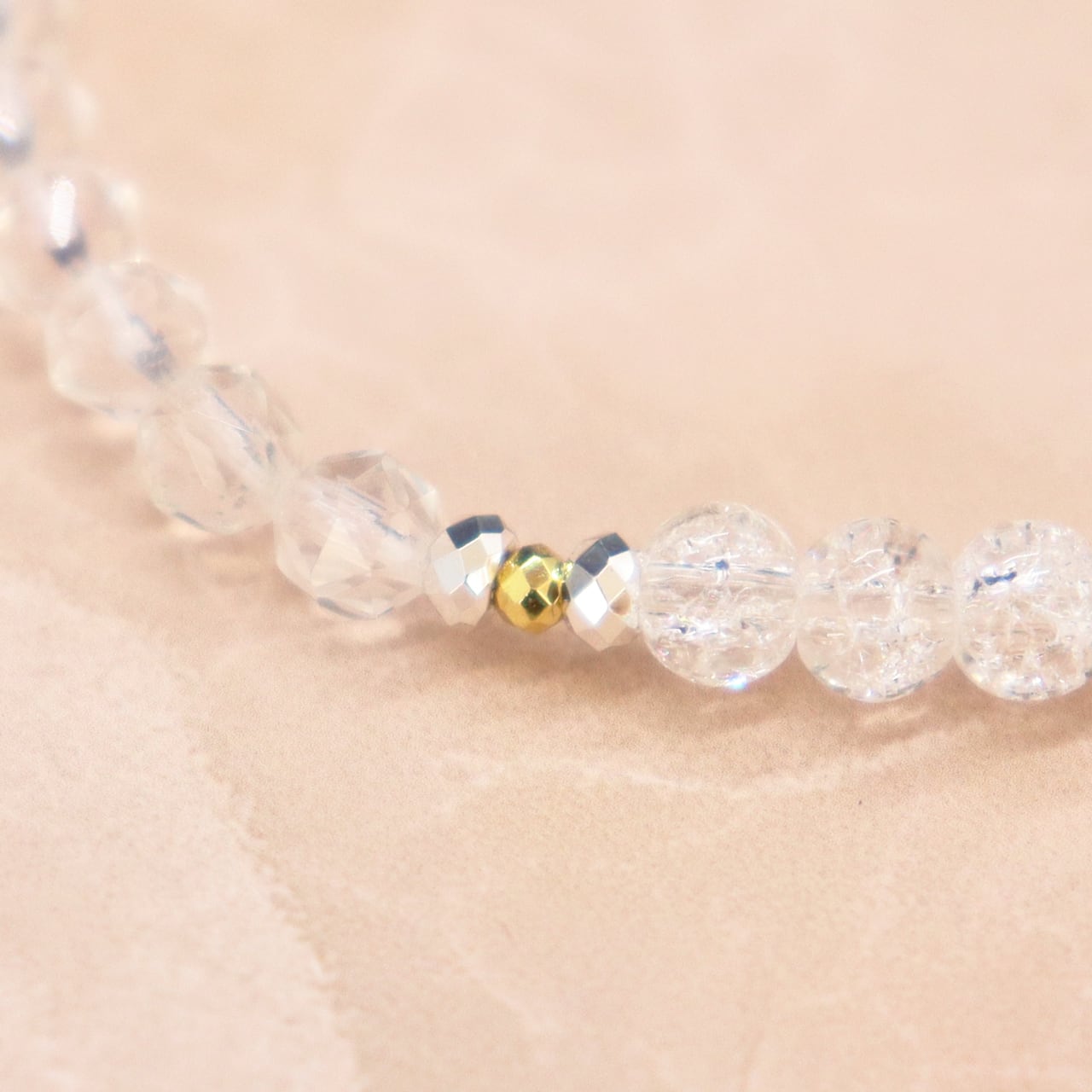 4月誕生石「水晶」に人工的な処理を施し、クラックを入れたものです。クラック(割れ)がネガティブな気を吸収して災厄を退け、持ち主に幸運をもたらすと言われています。