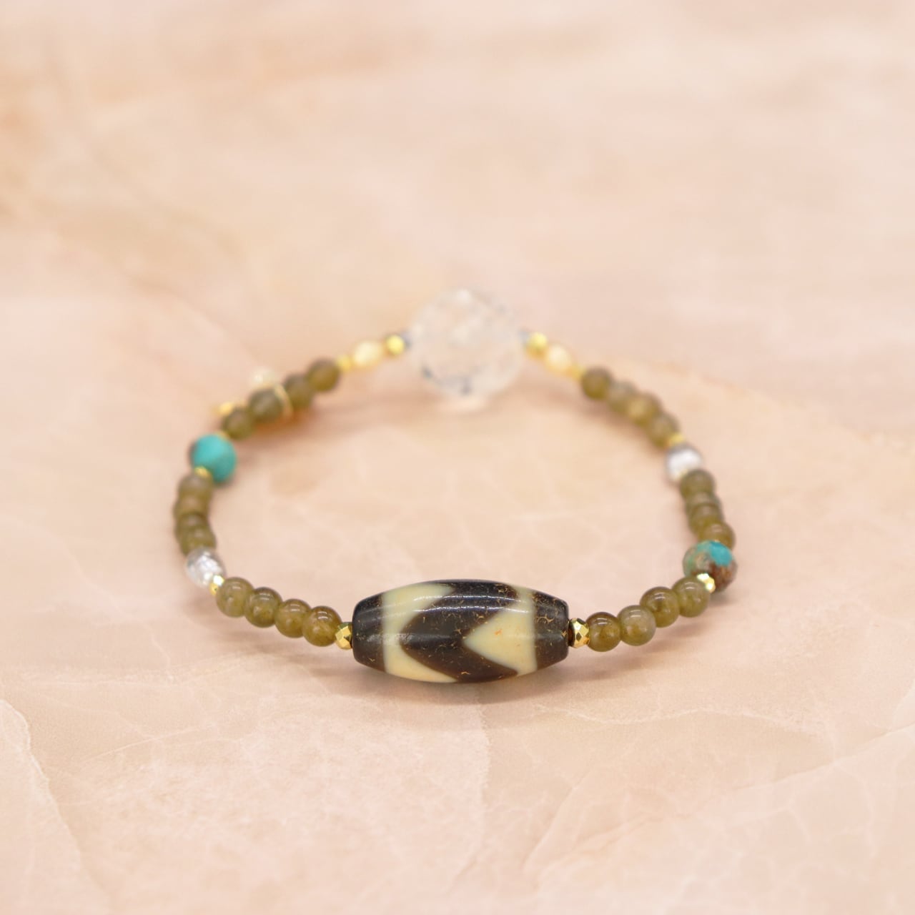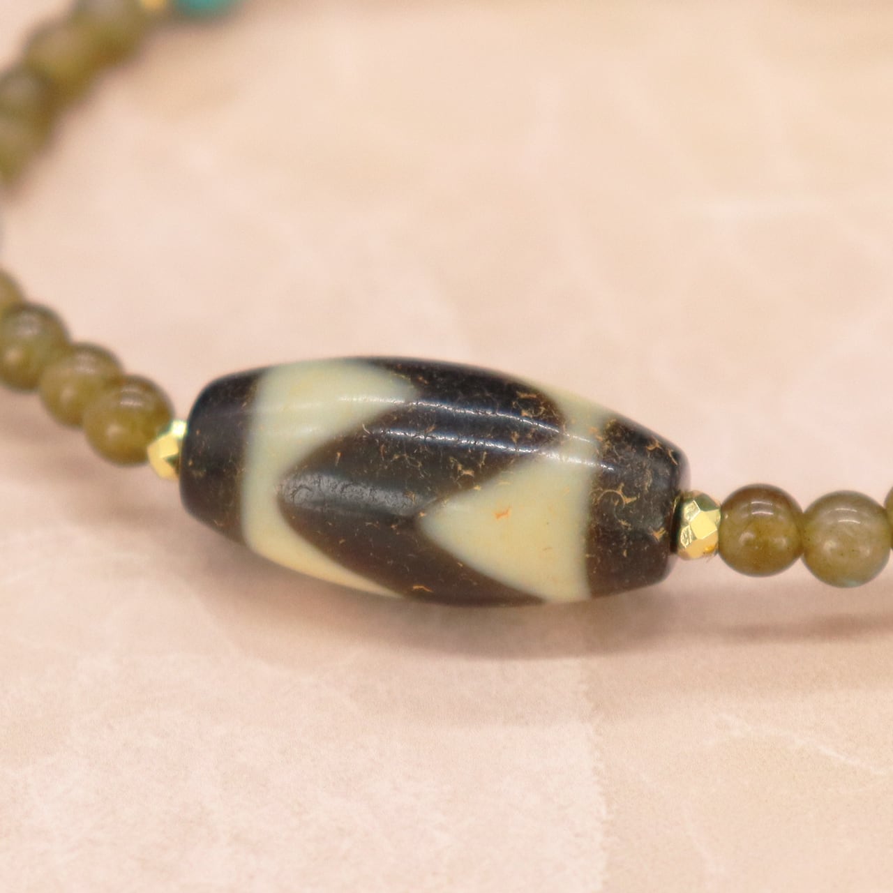 風化天珠は、長い年月をかけて自然にさらされ、表面に独特の風合いが生まれた天珠です。落ち着いた色味やかすれた模様が特徴で、アンティークのような深い味わいがあります。虎牙天珠は、虎の牙を象徴する力強い天珠。困難を乗り越え、勝利へ導くと言われています。