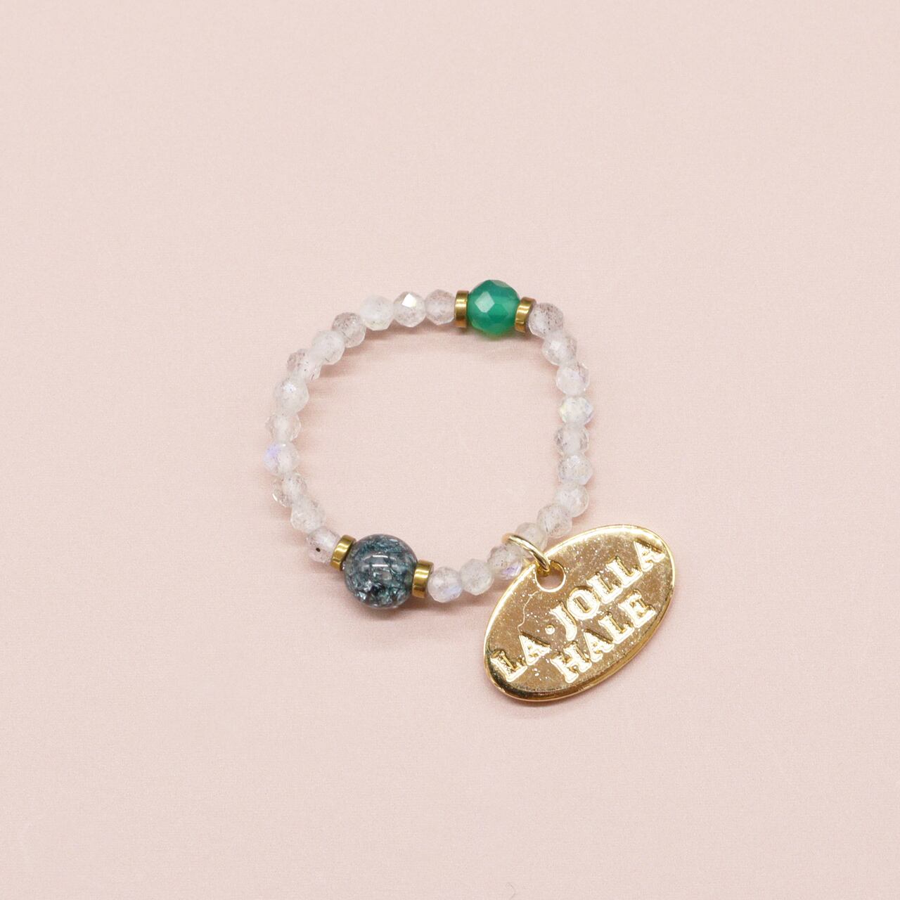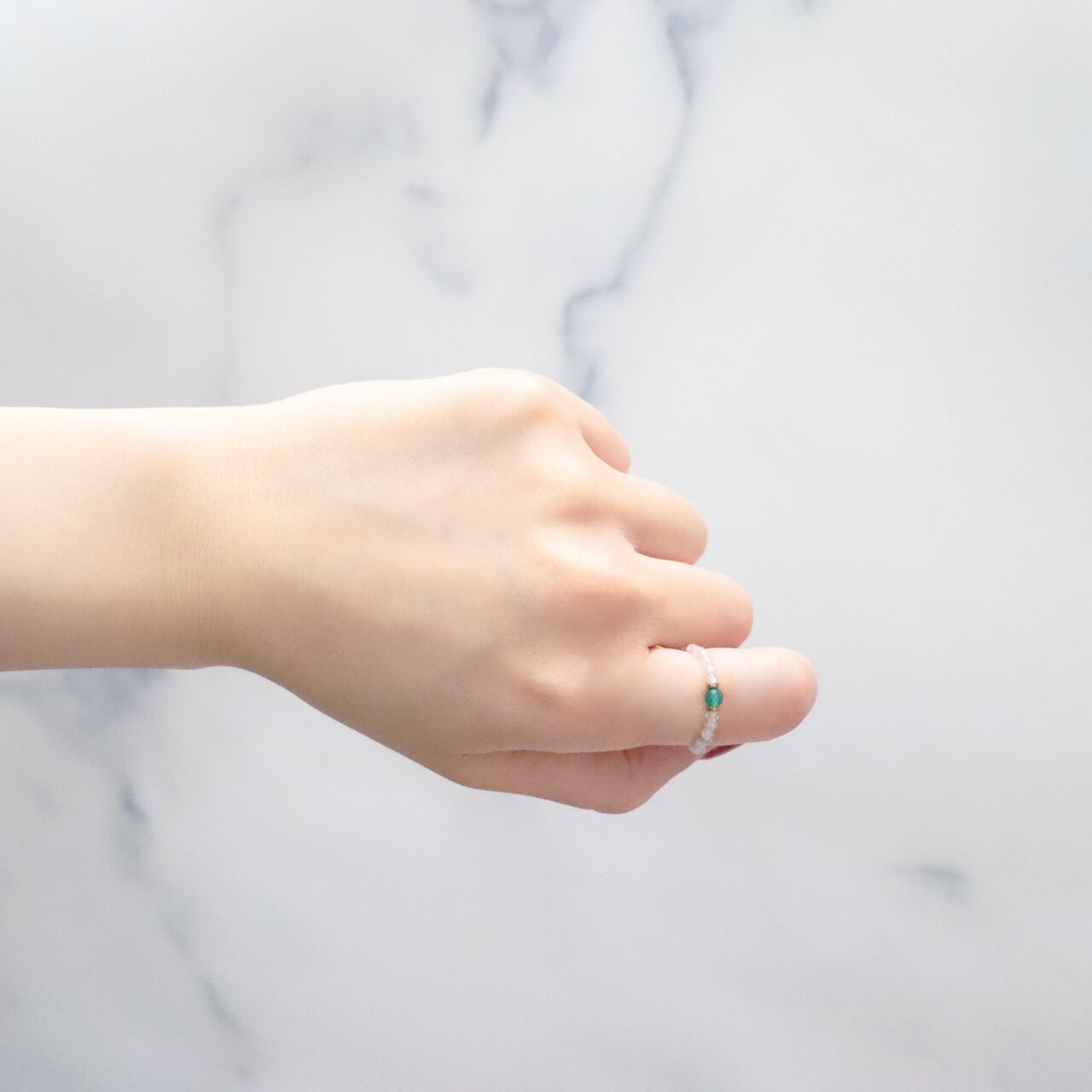 繊細なカットの天然石にアクセントカラーを添えた、華奢で上品なリング。