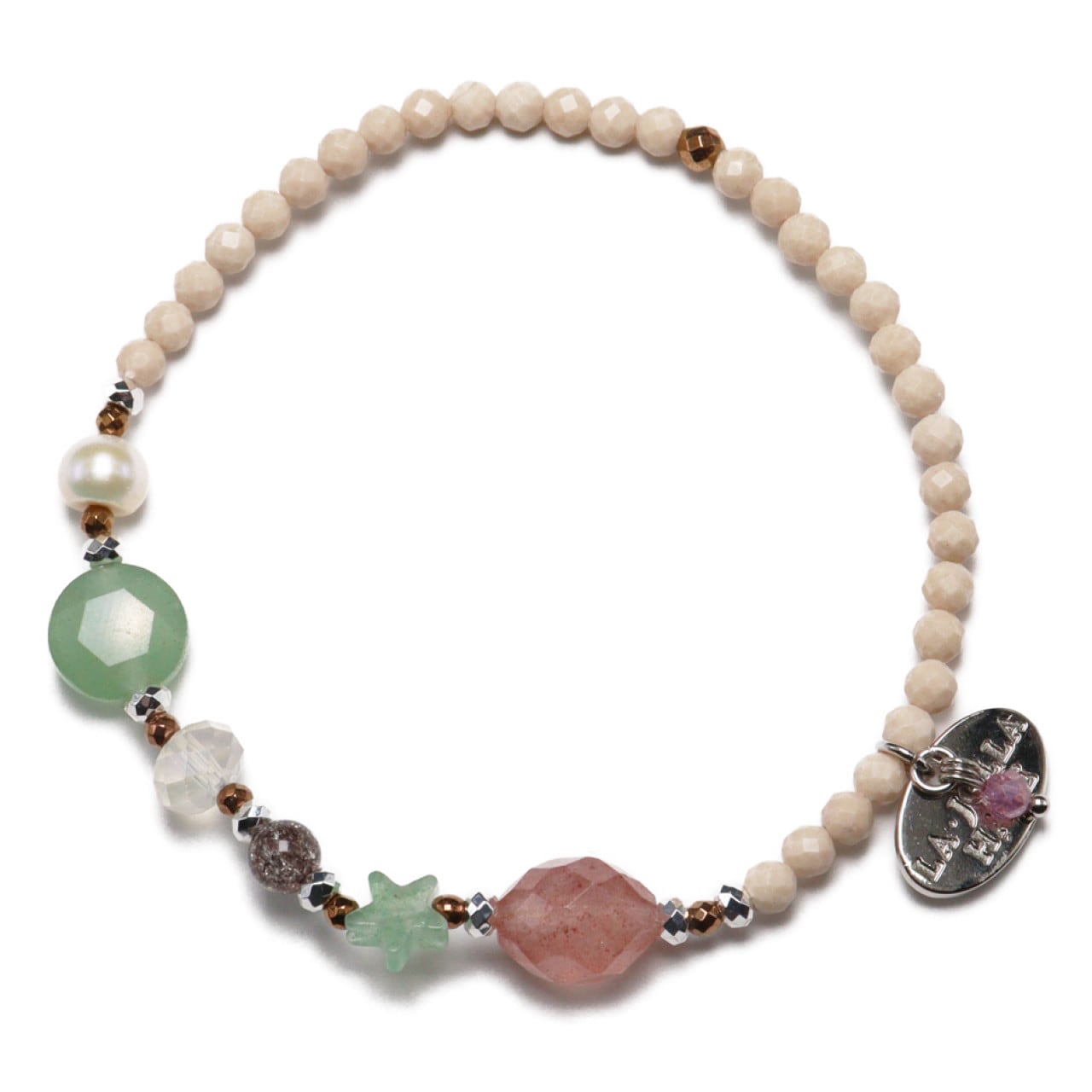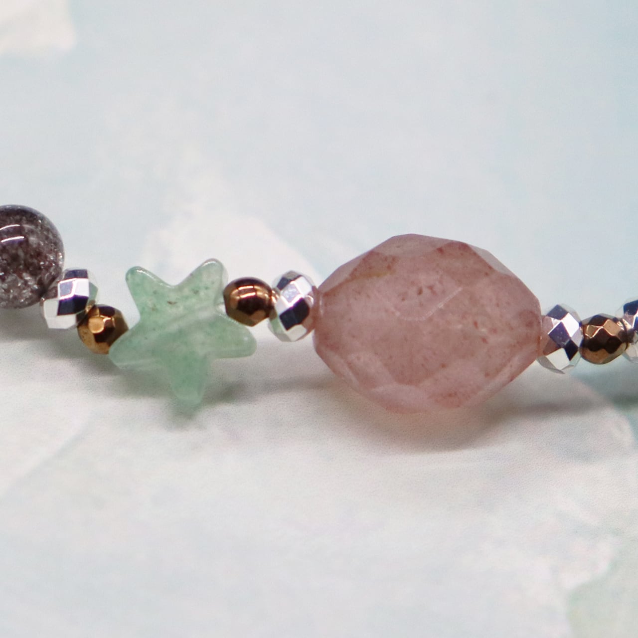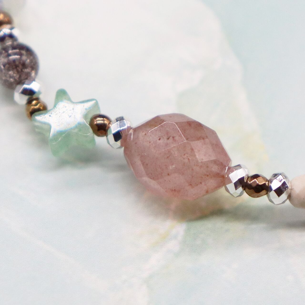 やわらかなベージュトーンに、グリーンやピンクの天然石をアクセントに
